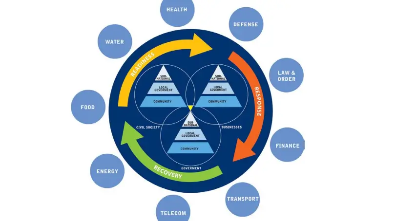 The diagram above in Fig. 3 depicts the whole-of-society approach[17]. It is illustrated by the three circles in the central point of the diagram: government, civil society, and business. The pyramids within each of the circles correspond to the levels within each sector (including sub national, local government, and community). The nine circles in the region of the disaster management continuum of readiness, response, and recovery symbolize nine key essential services).